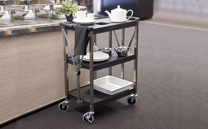 堅厚的不銹鋼材料,車表面帶有磨砂處理,美觀耐用卡扣設計,可快速、簡單的折疊或展開餐車; 折疊存放可減少50%的面積; 符合人體工學的把手設計,操作舒適; 4”萬向靜音輪,其中兩個帶剎;安全,安靜可承重150KG; 廣泛使用于各類餐廳和酒店.